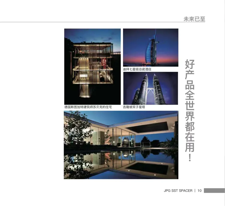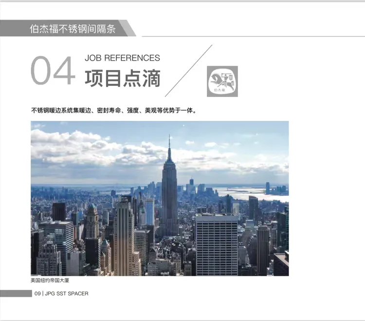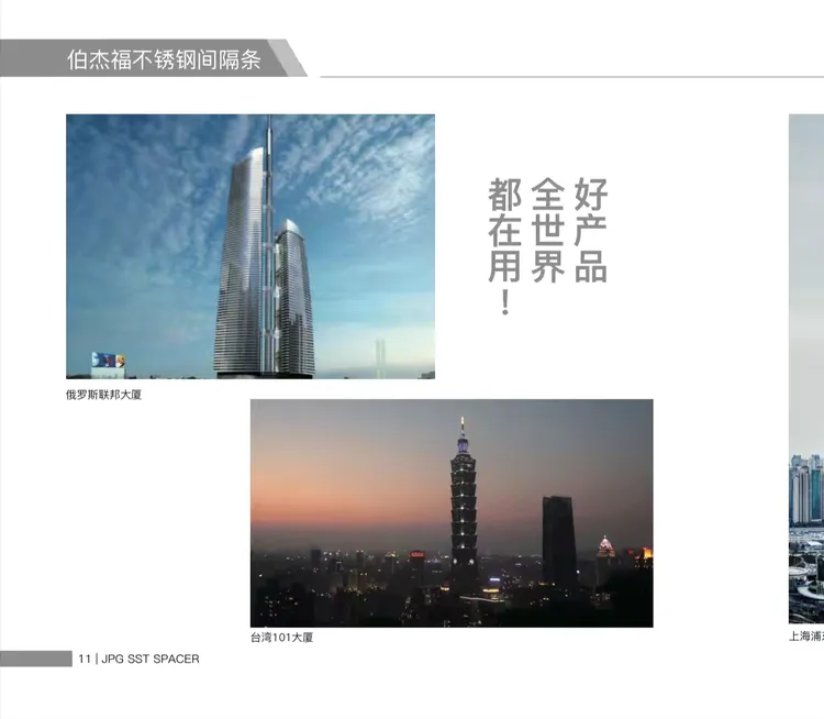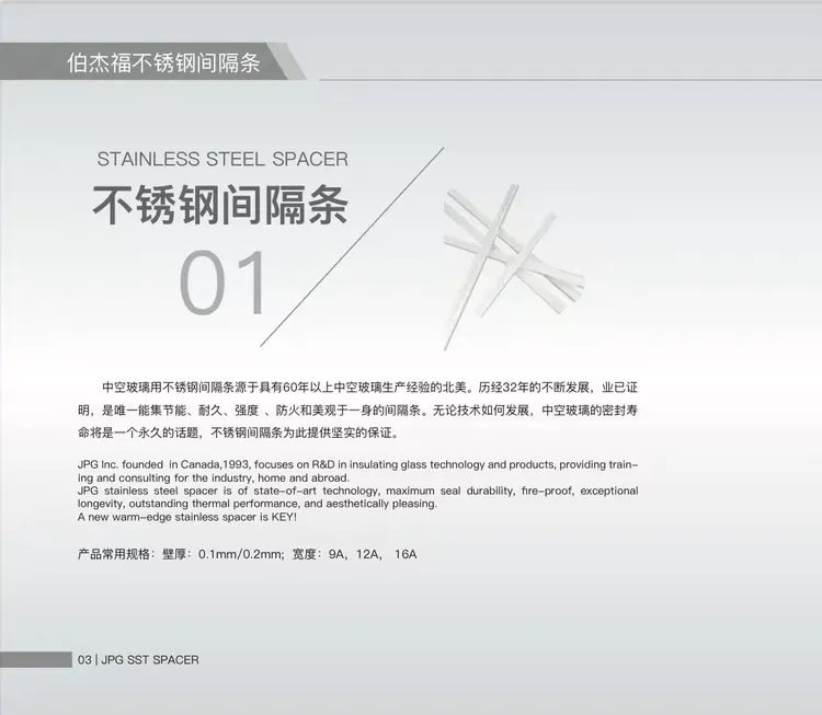 • 适用范围广:线性膨胀系数较低,使采用不锈钢间隔条制作的中空玻璃能适应全球各地不同气候条件,且能用于大板块的中空玻璃、高层建筑和风荷载大的地方。