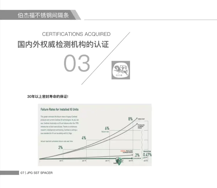 • 耐久性长:作为无机材料,不与离线低辐射玻璃的软镀膜发生反应,且与几乎所有密封胶都有良好的兼容性,有利于提高中空玻璃的密封寿命。